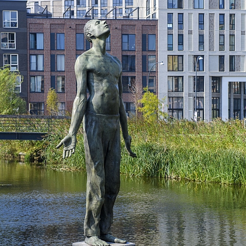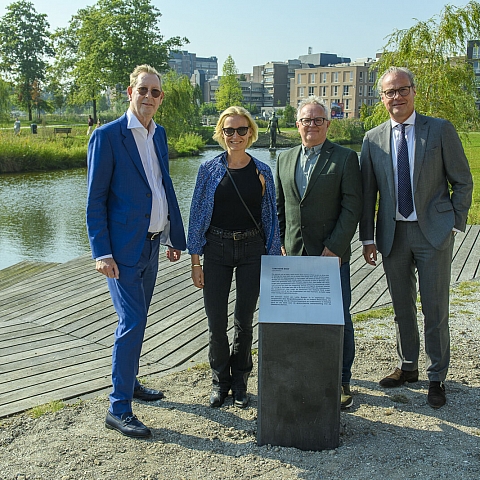 Diemen, 18 september 2024 – In het Thérèse Schwartzepark in Diemen Zuid is vandaag een indrukwekkend kunstwerk onthuld. Het bronzen beeld, gemaakt door de gerenommeerde Nederlandse kunstenares Lotta Blokker, werd tijdens een feestelijke ceremonie onthuld in het bijzijn van wethouders Hans Prins en Marian Everhardt. Het ruim 3,5 meter hoge beeld draagt de titel ‘I AM HERE NOW’ en stelt een ontspannen jonge man voor, die midden in de vijver staat.