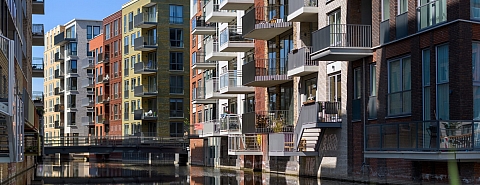 Nu staan er kleurrijke, gevarieerde gevels in lange, gebogen lijnen langs smalle grachten. Talloze variaties in balkonhekjes, bakstenen en metselpatronen, in- en uitspringende kozijnen lijken er te zijn gebruikt. Loop je wat langer rond dan zie je herhalingen, maar telkens in andere constellaties. Geen gevel is exact hetzelfde, maar ze zijn wel allemaal familie van elkaar.